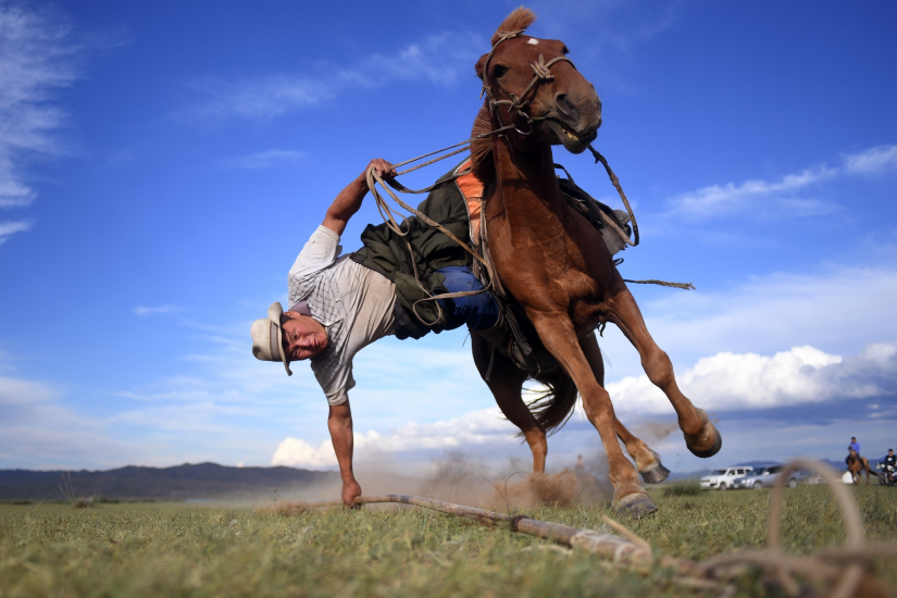 Энэхүү зурагт үндэсний спорт наадмаар адуучид уургыг нэг шүүрэлтээр авдаг бөгөөд үүнийг 20-30 см зайнаас авсан нь монгол адуу давхиж байх үедээ байнга доод талаа мэдэрч явдаг, хэзээ ч чулуу өшиглөдөггүй, тарваганы нүхэнд үлийнд хөлөө хийдэггүйг тооцож аппаратаа байрлуулсан нь гайхамшигтай ур чадвар юм. Мөн хөх тэнгэрээ гаргаж, алслалт гээд бүх зүйлийг тооцоолж байж авсан гэдгээрээ илүү онцлогтой болсон байна. Энэ зургийг Төв аймгийн Лүн суманд авсан юм.