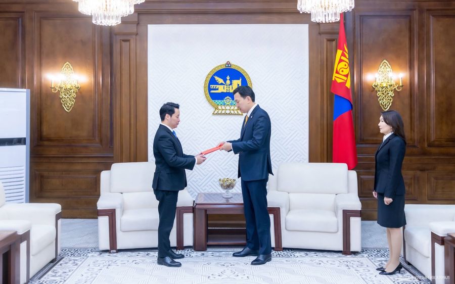Улаанбаатар, 2025 оны арванхоёрдугаар сарын 15 /МОНЦАМЭ/. Монгол Улсын Их Хурлын дарга Н.Учралд өнөөдөр  Элчин сайд нарыг эгүүлэн татах, томилох талаарх Монгол Улсын Ерөнхийлөгчийн  зөвшилцөх саналыг Ерөнхийлөгчийн Тамгын газрын дарга А.Үйлстөгөлдөр өргөн мэдүүллээ.