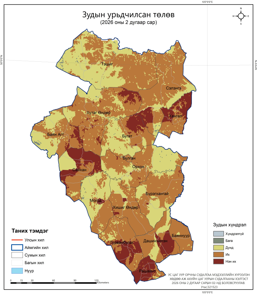 Ус цаг уур, орчны судалгаа, мэдээллийн хүрээлэнгээс 2026 оны 2 дугаар сарын зудын урьдчилсан төлөвийг газрын ажиглалтын болон хиймэл дагуулын мэдээ болох ган, зуншлага, 2025-2026 оны өвөл-хаврын бэлчээрийн даац, ургац, агаарын температур, хур тунадасны дундажтай харьцуулсан хазайлт, цасны зузаан болон 2 дугаар сарын агаарын температур, хур тунадасны урьдчилсан төлөв зэрэг мэдээлэлд үндэслэн боловсруулдаг ажээ.