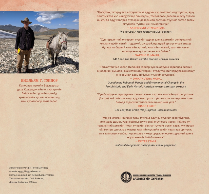 Улаанбаатар, 2026 оны хоёрдугаар сарын 23 /МОНЦАМЭ/. АНУ-ын Колорадогийн их сургуулийн профессор Вилльям Т.Тэйлорын “Туурайн төвөргөөн: Адуу хүн төрөлхтний түүхийг өөрчилсөн нь” ном доктор Ж.Баярсайханы орчуулснаар монгол хэлээр хэвлэгдэхэд бэлэн болжээ.
