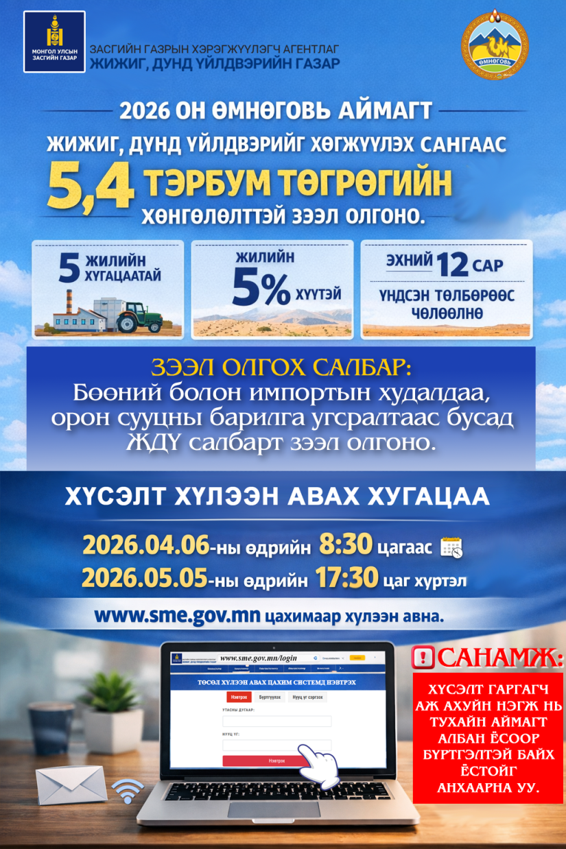 Улаанбаатар, 2026 оны дөрөвдүгээр сарын 8 /МОНЦАМЭ/. ЖДҮ-ийг хөгжүүлэх сангаас Өмнөговь аймагт 5.4 тэрбум, Говьсүмбэр аймагт 1.5 тэрбум төгрөгийн хөнгөлөлттэй зээл олгох төслийг хүлээн авч эхэлжээ.