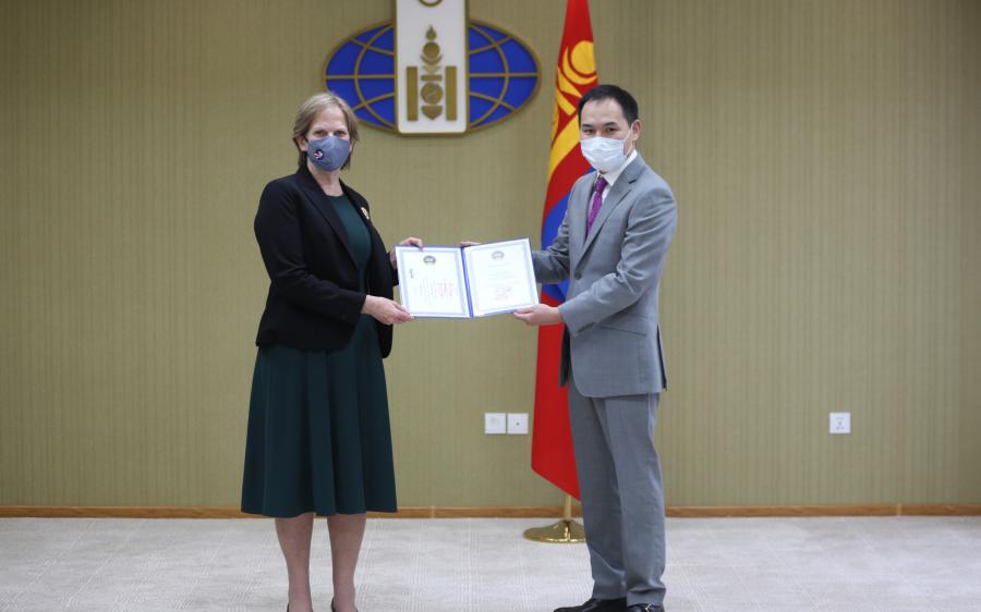 Ulaanbaatar /MONTSAME/. On June 24, 2021 Deputy Foreign Minister Munkhjin Batsumberel presented the Order of Polar Star, the highest state honor, to Kim Mansaray, Country Director of Peace Corps Mongolia.