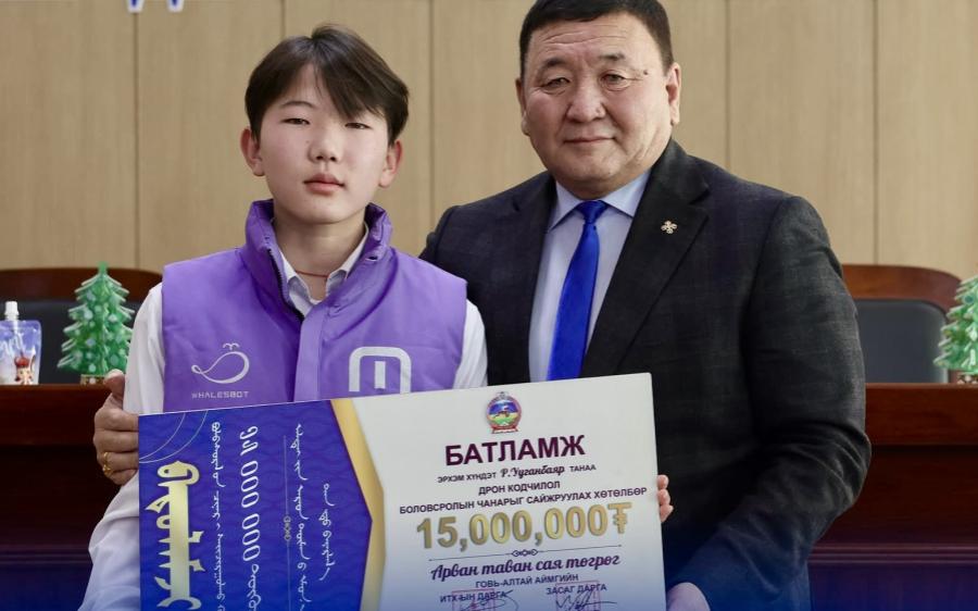 Говь-Алтай, 2026 оны нэгдүгээр сарын 2 /МОНЦАМЭ/. Дэлхийн аваргаас алтан медаль хүртсэн Есөнбулаг сумын хоёрдугаар сургуулийн есдүгээр ангийн сурагч Р.Ууганбаярт 15 сая төгрөгийн урамшуулал олгов.