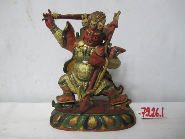 Энэ бурхныг ажвал, Бадамлянхуа цэцгэн хагас саран мандал дээр зүүн бойвоо жийж хүн гишгэсэн, баруун бойвоо хагас нугалан амьтан гишгэсэн, алтан шаргал өнгөөр хээлэн чимсэн монгол гуталтай харагдана. Мөн баруун мутартаа сэлэм барьж далайсан, зүүн мутартаа энгэртээ авч нум сум, зэрээ, зүрх зэргийг атгасан, шаргал өнгийн хуяг бүхий өмсгөлтэй, тэргүүндээ таван хохимой чимэгтэй, үсийг сэгсийлгэн, амаа ангайн соёо шүдээ ярзайлгасан, мутар болон нүүр улаан өнгөөр тодруулсан улаан хилэнт дүр дүрслэлтэй модон сийлбэр юм.