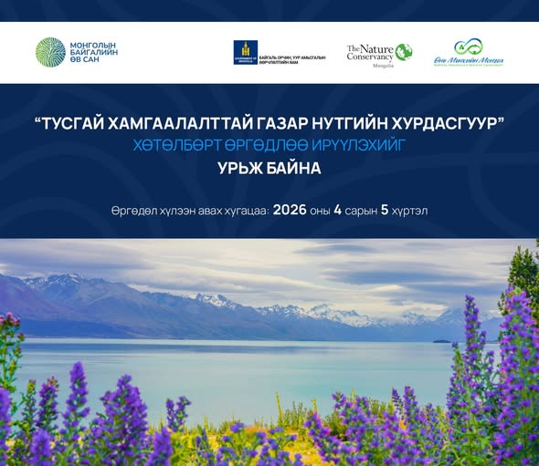 "Өнө мөнхийн Монгол" байгаль хамгааллын байнгын санхүүжилтийн хөтөлбөрийн хүрээнд ТХГН-ийн хамгаалалтын захиргаадын менежментийн үр ашигтай байдлыг нэмэх, урт хугацааны тогтвортой санхүүжилт бий болгох, нутгийн иргэдийн оролцоох дэмжих зорилготой тус хөтөлбөрийг 2026-2029 он хүртэл 2 үе шаттай хэрэгжүүлнэ. Ингэхдээ ТХГН-ийн хамгаалалтын 11 захиргааг сонгон шалгаруулах бөгөөд гранттай холбоотой мэдээлэл өгөх уулзалтыг энэ сарын 13-нд цахимаар зохион байгуулж, өргөдлийг 4 дүгээр сарын 5-ныг хүртэл хүлээн авах юм.