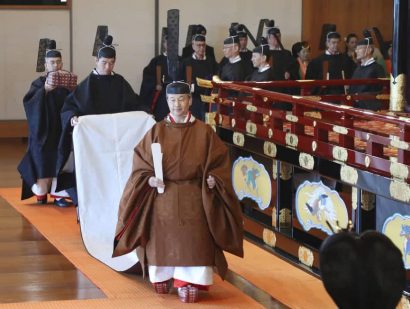 Ёслолын эхэнд Эзэн хаан Нарухито Касикодокоро сүмд морилж Нарны бурханд мөргөж, Төрийн ёслол хааны ордонд үргэлжлэв. Ерөнхий сайд Абэ Шинзо эзэн хаанд урт наслахыг ерөөсөн уламжлалт мэндчилгээ дэвшүүллээ. Үндсэн хууль, эзэн хааны гэр бүлийн тухай хуульд заасны дагуу Нарүхито хаан ширээнд сууж Япон Улсад шинэ үе ирснийг зарлав. Эзэн хаан Нарүхито, ард түмнийхээ эв нэгдлийн бэлгэдэл болох үүргээ нэр төртэй биелүүлэхээ тангараглаж, эцэг Акихито 30 гаруй жил хаан ширээнд суухдаа ард иргэдтэйгээ хамт баяр баясгалан, уй гашууг хуваалцаж байсныг онцоллоо. Тэрбээр, "Японы ард түмэн мэргэн ухаан, тасралтгүй зүтгэлийн ачаар хөгжил дэвшилд хүрч, олон улсын хамтын нийгэмлэгт найрамдалт, энх тайван тогтнолыг бий болгоход хувь нэмэр оруулна гэдэгт чин сэтгэлээсээ найдаж байна" хэмээв.
