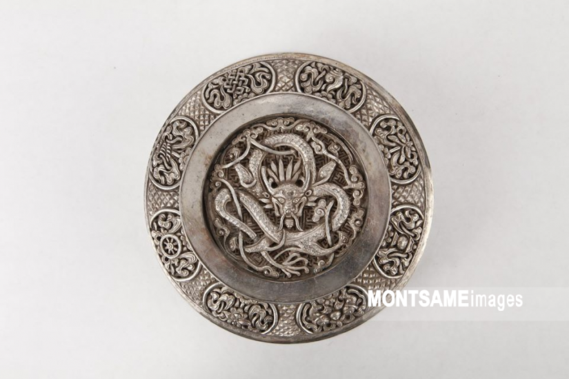 同県ダリガンガ郡の有名な鍛冶屋の1人であるダンバ・モロム氏が制作した銀椀だ。D.モロム鍛冶屋は、仏教の八宝、4人の強大な動物(ドラゴン、タカ、ライオン、トラ)およびトーノルジン模様などにドラゴンを組み合わせて彫刻することで優れている彫刻家だった。