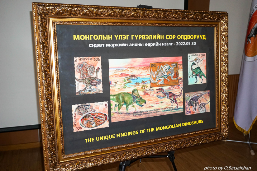 5月30日、モンゴル科学アカデミー古生物学研究所で、「モンゴル恐竜発見」の5ブロック切手の発刊式が行われた。同切手には、 モンゴルで発見された世界的に有名な恐竜の 骨から研究と科学的実績に基づいて復元した画像が含まれている。そのうち、シチパティ恐竜が卵を産む姿まで描いている。