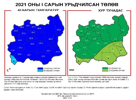 Нэг болон хоёрдугаар арав хоногийн сүүлч, гуравдугаар арав хоногийн дунд үеэр ихэнх нутгаар агаарын температур өмнөх үеэс 5–10°С–аар хүйтэрнэ. Тус аймгийн ихэнх нутгаар олон жилийн дунджаас ахиу, нутгийн баруун болон зүүн өмнөд хэсгээр ОЖД–ийн орчим цас орох төлөвтэй байгаа бөгөөд нэг, хоёр, гуравдугаар арав хоногийн сүүлчээр ихэнх нутгаар цас орно.