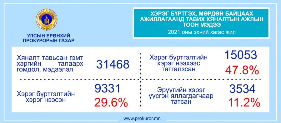 Энэ оны эхний хагас жилд прокурорын байгууллагаас нийт 31468 гэмт хэргийн талаарх гомдол, мэдээлэлд хяналт