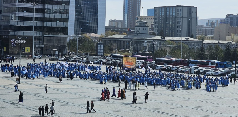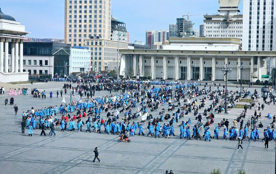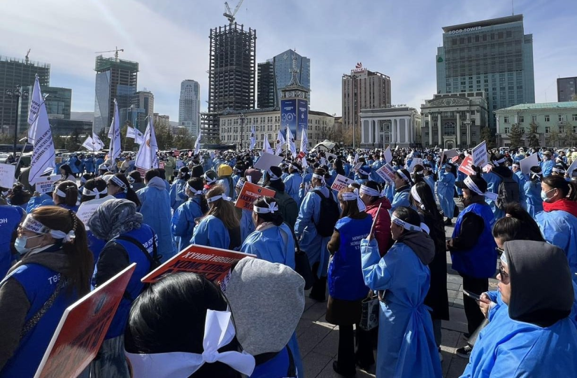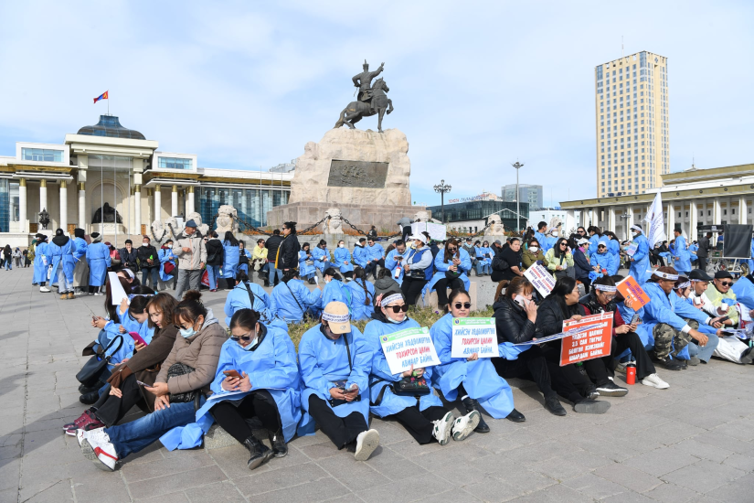 Улаанбаатар, 2025 оны аравдугаар сарын 9 /МОНЦАМЭ/. Эмч, эмнэлгийн ажилтнууд цалин нэмэхийг шаардан Д.Сүхбаатарын талбайд өнөөдөр жагслаа.