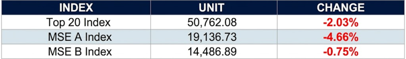 The declines indicate broad market weakness. The sharper drop in the MSE A Index suggests stronger downward pressure on large- and mid-cap companies. Seasonal factors contributed to market movements during the week.
