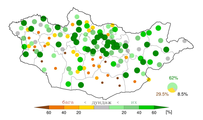 Харин хур тунадасны хувьд тус сард Монгол орны хэмжээнд дунджаар 25.9 мм тунадас орсон нь өмнөх жилийнхээс 19.3 хувиар бага, олон жилийн дунджаас 43 хувиар ахиу буюу 1940 оноос хойш тохиолдож байгаа 17 дахь хур тунадас ихтэй сар болж өнгөрлөө. Сарын нийлбэр хур тунадасны олон жилийн дунджаас хазайх хазайлтын оронзайн тархалтыг авч үзвэл нийт нутгийн 62 хувь дунджаас ахиу, 8.5 хувь нь дунджийн орчим, 29.5 хувь нь дунджаас бага тунадас унасан байна.
