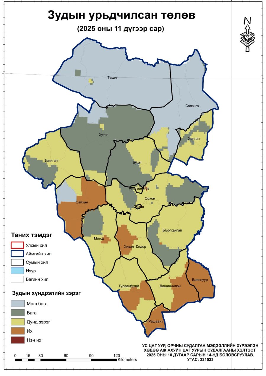 Зудын урьдчилсан төлөвийг газрын ажиглалтын болон хиймэл дагуулын мэдээ буюу ган, зуншлага, 2025-2026 оны өвөл-хаврын бэлчээрийн даац, бэлчээрийн ургац, агаарын температур, хур тунадасны дундажтай харьцуулсан хазайлт, цасны бүрхэц, зузаан болон 11 дүгээр сарын агаарын температур, хур тунадасны урьдчилсан төлөв зэрэг мэдээлэлд үндэслэн нэг сарын урьдчилгаатайгаар тооцоолон гаргасан байна.