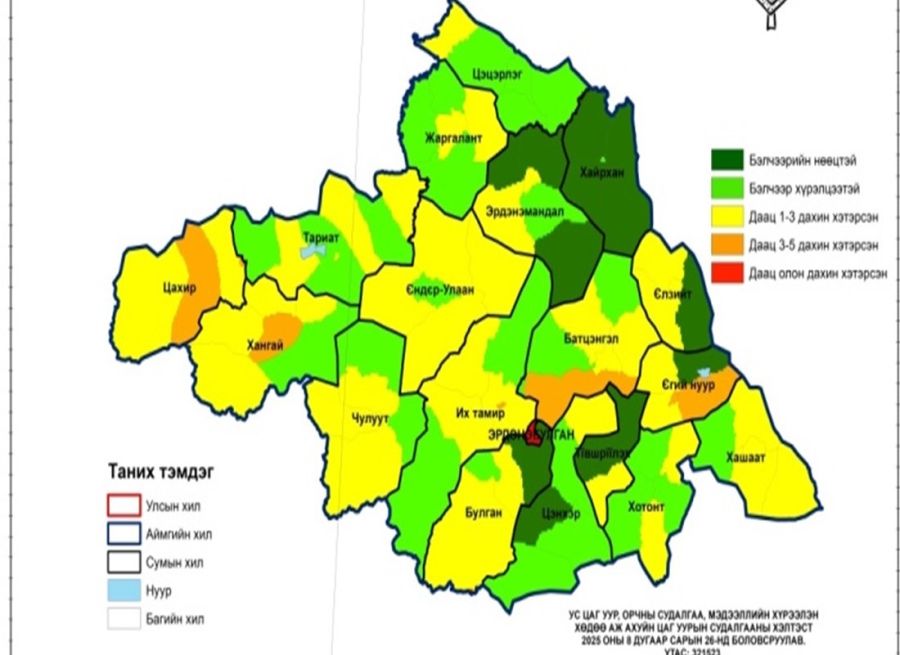 Монгол Улсын Засгийн газрын 286 дугаар тогтоолын дагуу Ус, цаг уур, орчны судалгаа, мэдээллийн хүрээлэнд 2025-2026 оны өвөл, хаврын бэлчээрийн даацыг баг бүрийн бэлчээрийн ургац, малын тоо, бэлчээрийн талбайн хэмжээ болон бэлчээр ашиглах хугацаа зэрэг мэдээлэл дээр үндэслэн багийн нутгаар тооцоолсон байна.