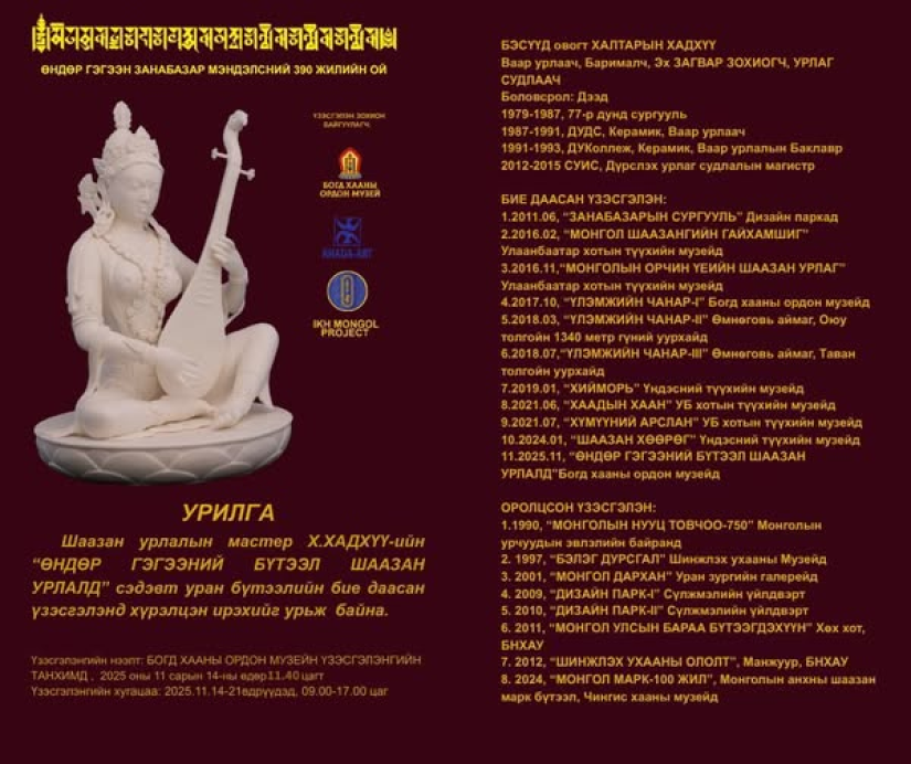 1114日:值此温都尔格根扎纳巴扎尔诞辰390周年之际,陶艺家、装饰艺术家、美术硕士赫·哈德呼将在博格达汗宫博物馆举办“温都尔格根陶瓷艺术作品展”。