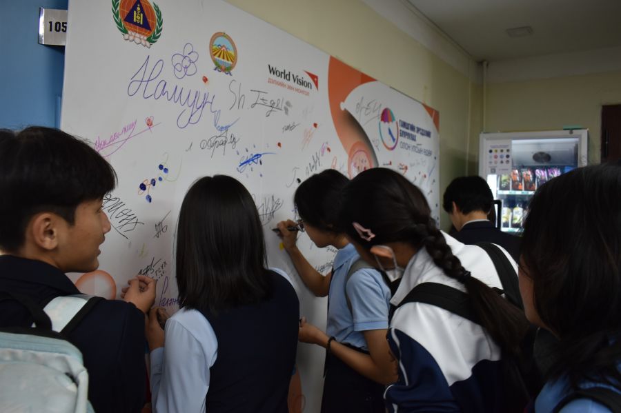 Сурагчид аюулт үзэгдэл, ослоос урьдчилан сэргийлэх зөвлөмж авсан төдийгүй гарын авлага, материал авч, “Гамшигт тэсвэртэй ирээдүйг бүтээхэд та бэлэн үү” самбар дээр гарын үсгээ зурлаа.