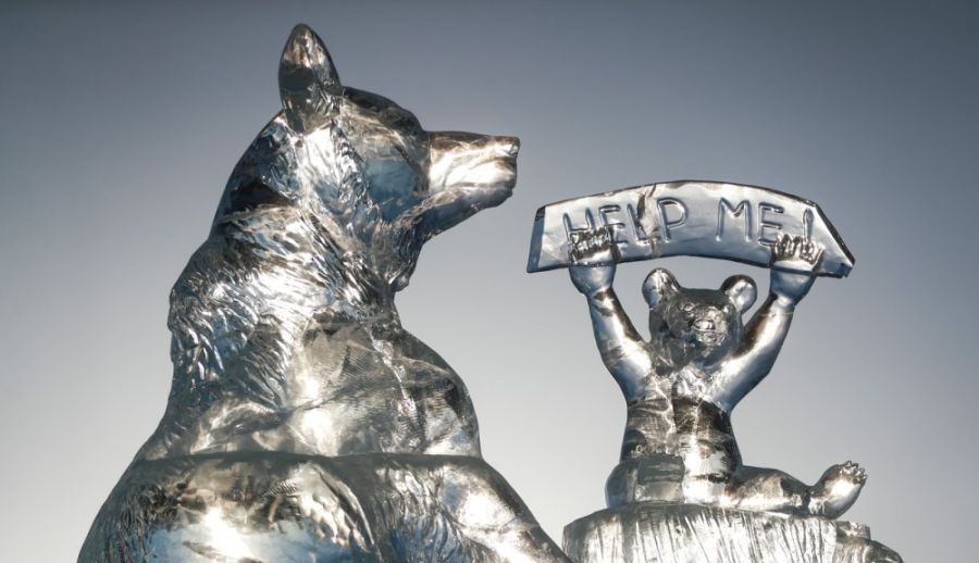 名冰雕艺术家展现了冰雕作品。