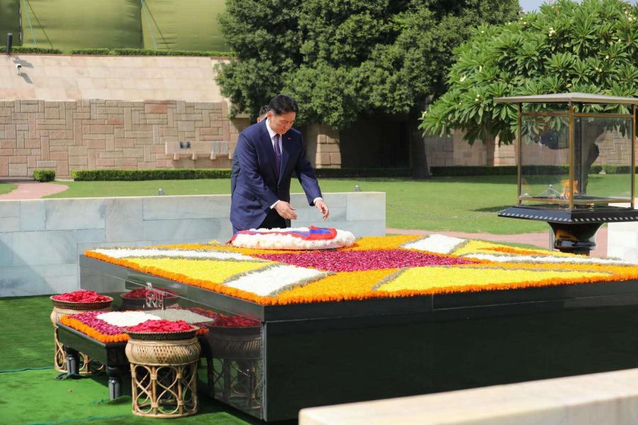蒙古国总统乌·呼日勒苏赫向圣雄甘地纪念馆敬献花圈