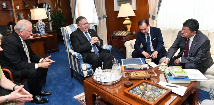 Ulaanbaatar/MONTSAME/ Foreign Affairs Minister D.Tsogtbaatar, who is visiting the United States, met US Secretary of State Mike Pompeo, Under Secretary of State for Political Affairs T.Shannon, and Principal Deputy Assistant Secretary in the Bureau of East Asian and Pacific Affair Susan Thornton on May 21, exchanging views on Mongolia-US relations and cooperation.