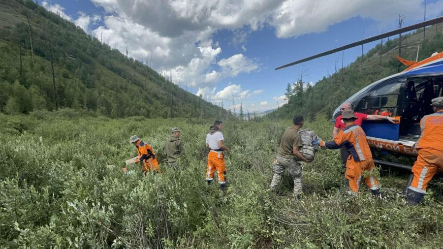 Мөрөн, 2025 оны наймдугаар сарын 1 / МОНЦАМЭ/. Хөвсгөл аймгийн Цагааннуур, Улаан-Уул суманд гарсан ойн түймрийг унтраах ажиллагааг зохион байгуулах тус аймгийн Онцгой байдлын газрын алба хаагчдыг ОБЕГ-ын харьяа Агаараас эрэн хайх, аврах 111 дүгээр ангийн нисдэг тэргээр тээвэрлэн хүргэж байна.