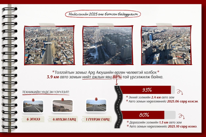 НЗДТГ-ын мэдээлснээр, эхний ээлжийн 2.4 км авто замын асфальтбетон хучилтын ажлыг хийж, 6 дугаар сард зорчих хөдөлгөөнийг нээсэн. Өнөөдрийн байдлаар тус 2.4 км авто замын ажлын явц 93 хувьтай байна. Үүнд, тохижилтын ажил 65 хувь, далан ухмалын ажил 100 хувь, зорчих хэсгийн ус зайлуулах лотки суурилуулалт 90 хувь, хашлага суулгах 96 хувь, замын тэмдэглэгээ 100 хувьтай байна. Харин үлдсэн 1.5 км авто замын хөдөлгөөнийг энэ сарын 30-нд нээнэ. Тус авто зам нь Ард Аюушийн өргөн чөлөөнөөс баруун тийш Содон хорооллын уулзвар хүртэл үндсэн замаас Саппорогийн уулзвар уруудах байдлаар үргэлжлэх аж. Авто замын нийт ажлын явц 80 хувьтай байна. Авто замын асфальтбетон хучилт дуусах шатандаа явж байна. Үүнд, талбайн цэвэрлэгээний ажил 74 хувь, ухмалын ажил 90 хувь, далангийн ажил 100 хувь, тулц хана 100 хувь, нэмэлт тулц хана 100 хувь, суурийн ажил 50 гаруй хувьтай үргэлжилж байна.