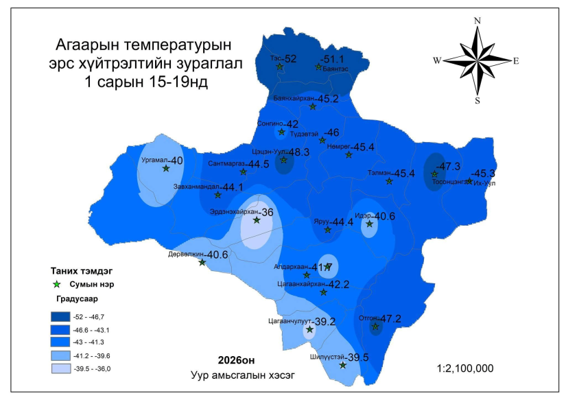 Ойрын өдрүүдэд Монгол орны нийт нутгаар хүйтний эрч эрс чангарч байгаа бөгөөд нэгдүгээр сарын 19-29-нийг дуусталх 10 хоногийн урьдчилсан мэдээгээр Завхан, Идэр, Тэс, Буянт голын хөндийгөөр шөнөдөө -44-49, өдөртөө -31-36 градус, Хангайн уулархаг нутгаар шөнөдөө -39-44, өдөртөө -27-32 градус, бусад нутгаар шөнөдөө -34-39, өдөртөө -20-25 градус хүйтэн байна.