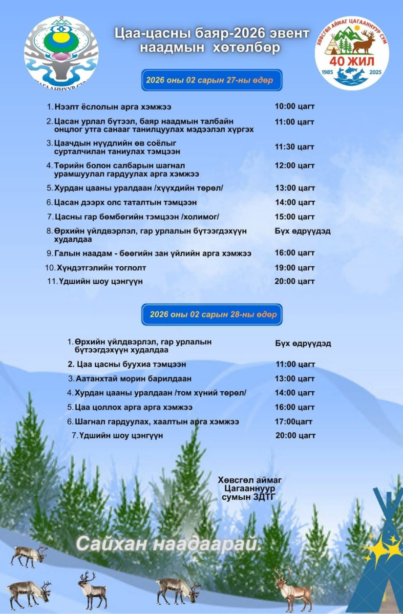 Мөрөн, 2026 оны хоёрдугаар сарын 24 /МОНЦАМЭ/. Хөвсгөл аймгийн цаатан иргэдийн аж амьдралыг олон нийтэд сурталчлан таниулах зорилготой “Цаа, цасны баяр-2026” өв соёлын наадам Цагааннуур суманд энэ сарын 27, 28-ны өдрүүдэд болно.