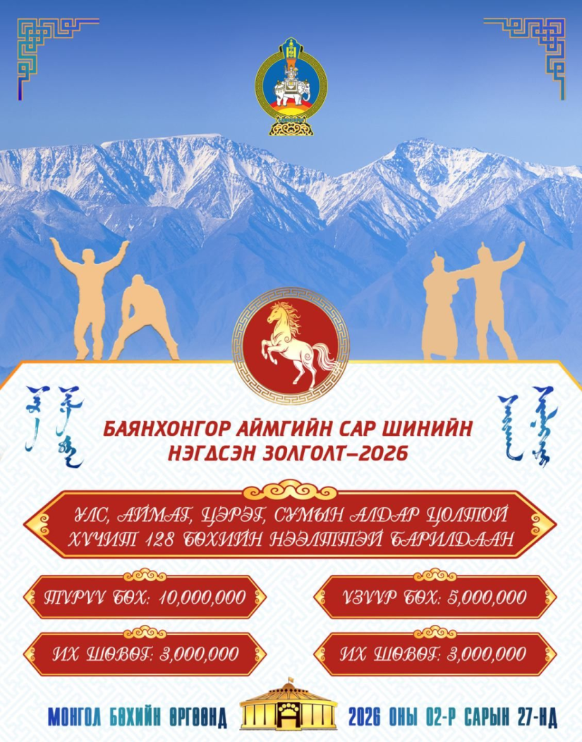 Баянхонгор, 2026 оны хоёрдугаар сарын 24 /МОНЦАМЭ/. “Сүрээр дарагч” хэмээх гал морин жилийн Баянхонгор аймгийн нэгдсэн золголтыг энэ сарын 27-нд Монгол бөхийн өргөөнд зохион байгуулна.