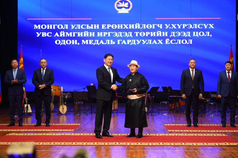 Тэрбээр аймгийн “Ойрад” ХЖТ-т иргэдтэй уулзалт хийж байна. Уулзалтын эхэнд Ерөнхийлөгч У.Хүрэлсүх эрхэлсэн ажилдаа амжилт гаргасан зарим хүмүүсийг төрийн дээд одон, медалиар шагналаа. Монгол Улсын Гавьяат багш цолоор Улаангом сумын ЕБ-ын 1 дүгээр сургуулийн захирал Г.Цэрэндулам, Монгол Улсын Гавьяат тээвэрчин цолоор Увс аймгийн Тээврийн удирдах газрын ахмад ажилтан С.Батбанди, Монгол Улсын Үйлчилгээний гавьяат ажилтан цолоор “Хөдөлмөрийн шим” хоршооны эзэн Б.Төвсанаа нарыг шагнаж урамшууллаа.