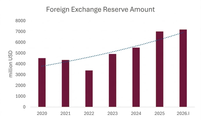 Mongolia’s official foreign exchange reserves stood at USD 7.19 billion at the end of the first quarter of 2026, rising by USD 182.5 million since the beginning of the year and reaching a record level.