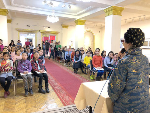 3月19日、バガトイーロード通りにあるモンゴル子ども芸術センターにおいて、母祥さんは、ここで芸術を学ぶ子ども達50人を前に、人形に衣装を着付けする実演を見せながら、やさしく子ども達に語りかけた。人と人形が通わす“こころ”の大切さ。そして、人形を通して日本伝統文化の奥深さと技術の粋の一端を披露した。自作の日本人形“やまとちゃん”をモデルに、着物の生地がカイコから生まれた絹であること、着物は母から子へ、子から孫へと何代にも伝えられ、作り直しが出来ること、帯が長いのは古くなれば切って使える便利さ、長い紐は着付けの道具として使うだけでなく、いざという時にはきれいな着物を守るたすきにして使えるなど、「分かりますか」と子ども達に寄り添いながら解説を続けた。「今回はプレゼントとして“さくらちゃん”という人形を置いていきます。寂しくないように可愛がってあげてね」と、子ども達と約束するなど、今後、長く続く日・モの文化交流に期待を寄せた。前回、出会ったモンゴルの人形作家チンバット・エンクーシーさんの才能を見出し、日本へ招いて次々と展覧会を開く道をサポートした。「私の人形は“静”、彼のは勤労する姿を作品化した“動”。二人の対比が面白い」と言う。技術向上の指南役も果たしている。人形の文化親善大使“さくらちゃん”を抱えて、次はドバイに行く。さらに世界各国巡り、特に子ども達に人形作りを手ほどきしたいという。まだまだ元気な83歳。