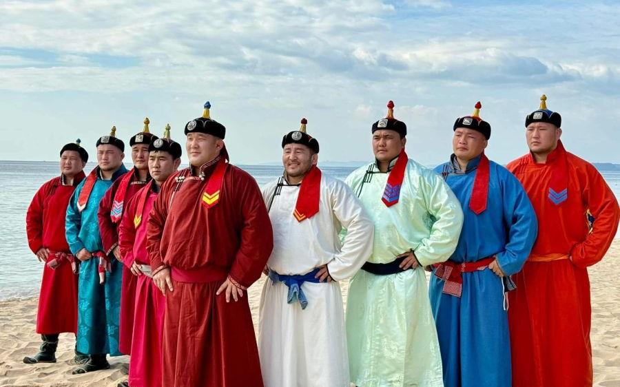 ビーチで行われた相撲実演 に、力士のD.フデルボルガ氏、G.ガンホヤグ氏、Sh.プレブガリド氏、N.ウスフバヤル氏、Ch.アルタンゲレル氏、M.ムンフバヤル氏、G.トゥルムンフ氏、S.ガンエルデネ氏、D.トゥグスエルデネ氏が参加している。