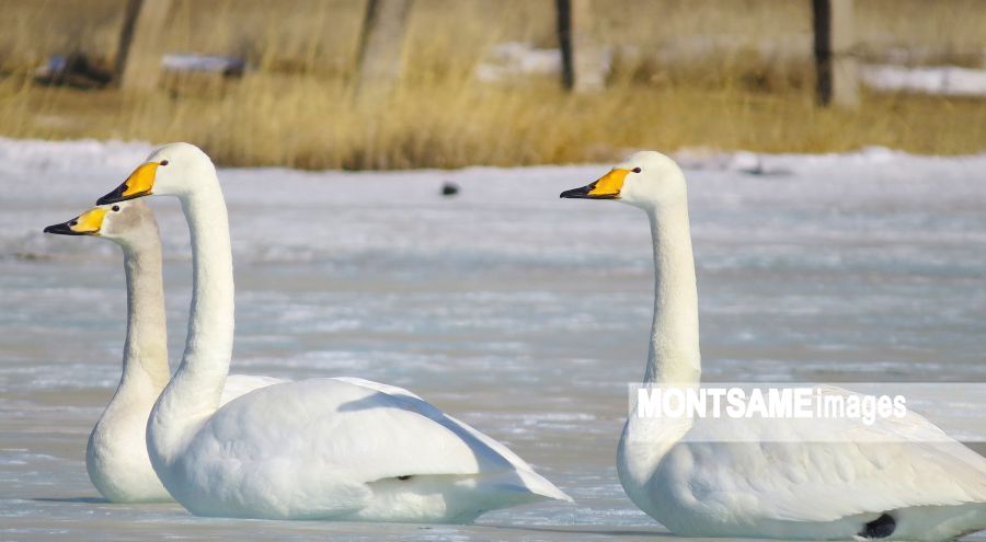 スフバートル県:氷で覆われた湖に、白鳥が美しさを運んできた