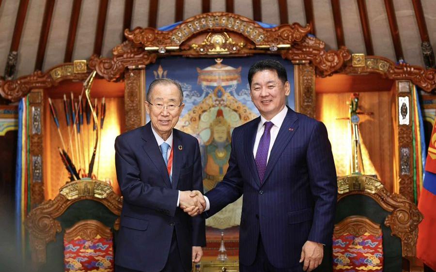 (ウランバートル市、2025年6月6日、国営モンツァメ通信社)オフナー・フレルスフ大統領は、「持続可能性に関する対話2025―気候変動:10億本の植林」フォーラムに出席中のパン・ギムン第8代国連事務総長と会談した。