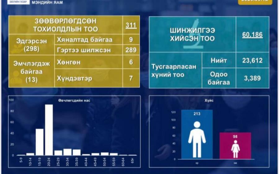 Монгол Улсад коронавирусийн халдварын 311 тохиолдол батлагдаж, 298 хүн эмчлэгдсэнээс есөн хүн сувиллын тусгаарлалтад байна.