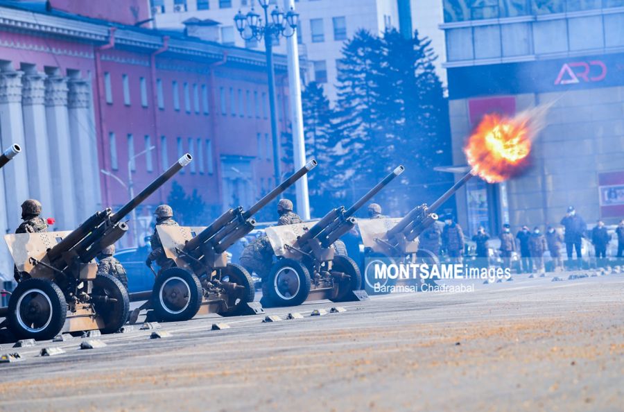 Улаанбаатар /МОНЦАМЭ/. Монгол Улсын Зэвсэгт хүчнийг үүсгэн байгуулсны 100 жилийн ой, "Монгол цэргийн өдөр"-т зориулан Сүхбаатарын талбайд Монгол Улсын Төрийн далбааг мандуулж, ёслолын буудлага хийлээ.