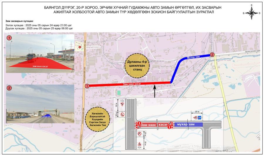 Улаанбаатар, 2025 оны тавдугаар сарын 22 /МОНЦАМЭ/. БГД-ийн 20 дугаар хороо, Эрчим хүчний гудамжны авто зам, Сонсголонгийн замын уулзвараас ТЭЦ-4-ийн зүүн уулзвар хүртэлх авто замыг энэ сарын 24-ний 23:00 цагаас 25-ны 06:00 цагийн хооронд хаана.