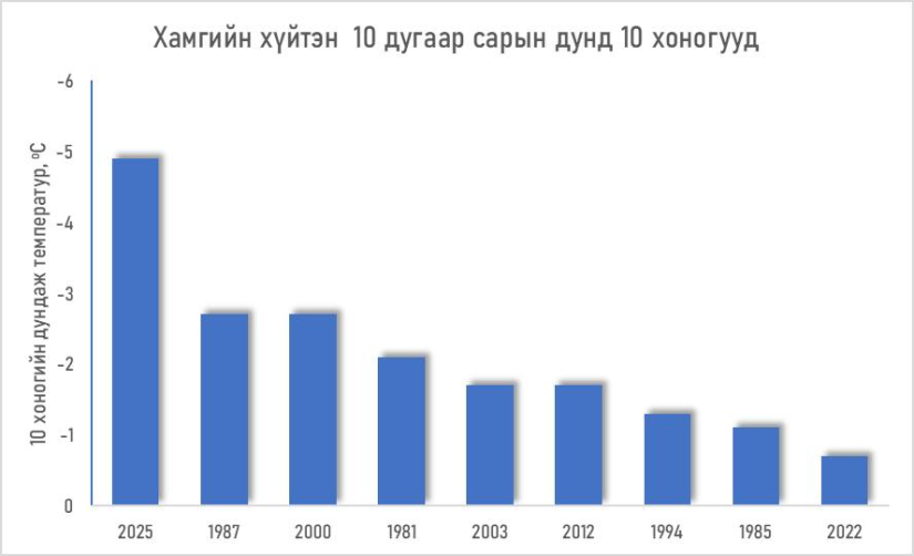Улаанбаатар, 2025 оны аравдугаар сарын 25 /МОНЦАМЭ/. Энэ сарын дунд 10 хоног (2025.10.11-20) нь 1981 оноос хойших аравдугаар сарын хамгийн хүйтэн өдрүүд болсныг ЦУОШГ мэдээлжээ.