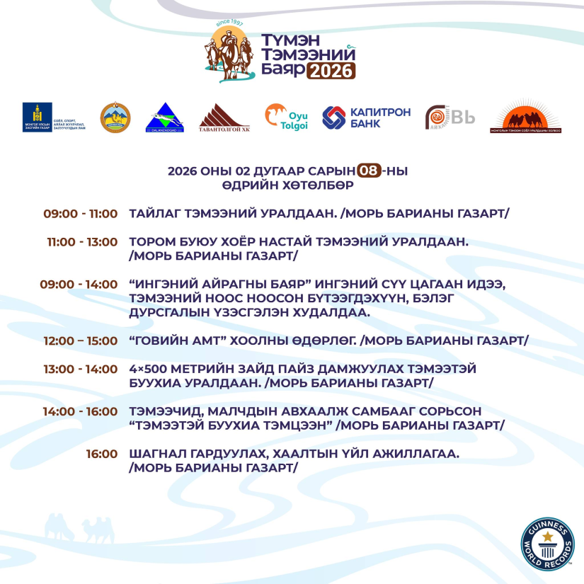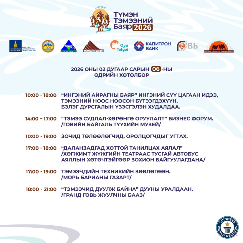 Даланзадгад, 2026 оны нэгдүгээр сарын 26 /МОНЦАМЭ/. Хоёр бөхт тэмээ болон говийн нүүдэлчин соёлыг түгээн дэлгэрүүлэх зорилготой “Түмэн тэмээний баяр-2026”-ыг хоёрдугаар сарын 6-8-ны өдрүүдэд Даланзадгад суманд 29 дэх жилдээ зохион байгуулна.