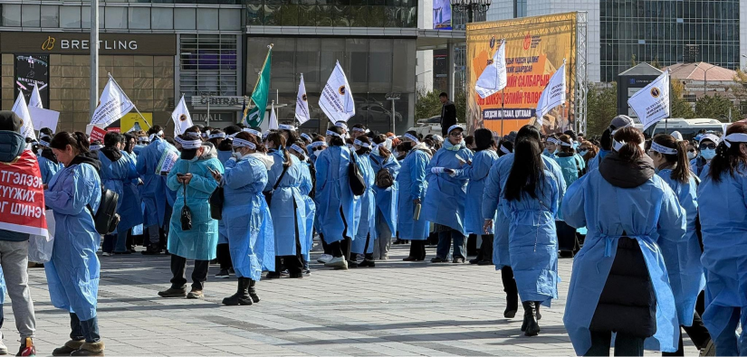 Улаанбаатар, 2025 оны аравдугаар сарын 9 /МОНЦАМЭ/. Эмч, эмнэлгийн ажилтнууд цалин нэмэхийг шаардан Д.Сүхбаатарын талбайд өнөөдөр жагслаа.