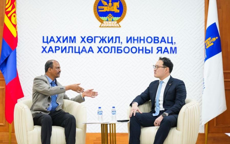 Улаанбаатар, 4 декабря, 2025 /МОНЦАМЭ/. Министр цифрового развития, инноваций и коммуникация Энхбаярын Батшугар принял Чрезвйчайного и Полномочного Посла Республики Индия в Монголии Атула Малхари Готсурвета.